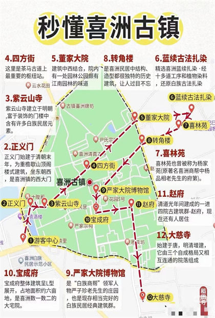 正義門--紫云寺--四方街--董家大院--藍續(xù)古法扎染--喜林苑--轉(zhuǎn)角樓--嚴家大院博物館--寶成府--趙府--大慈寺
